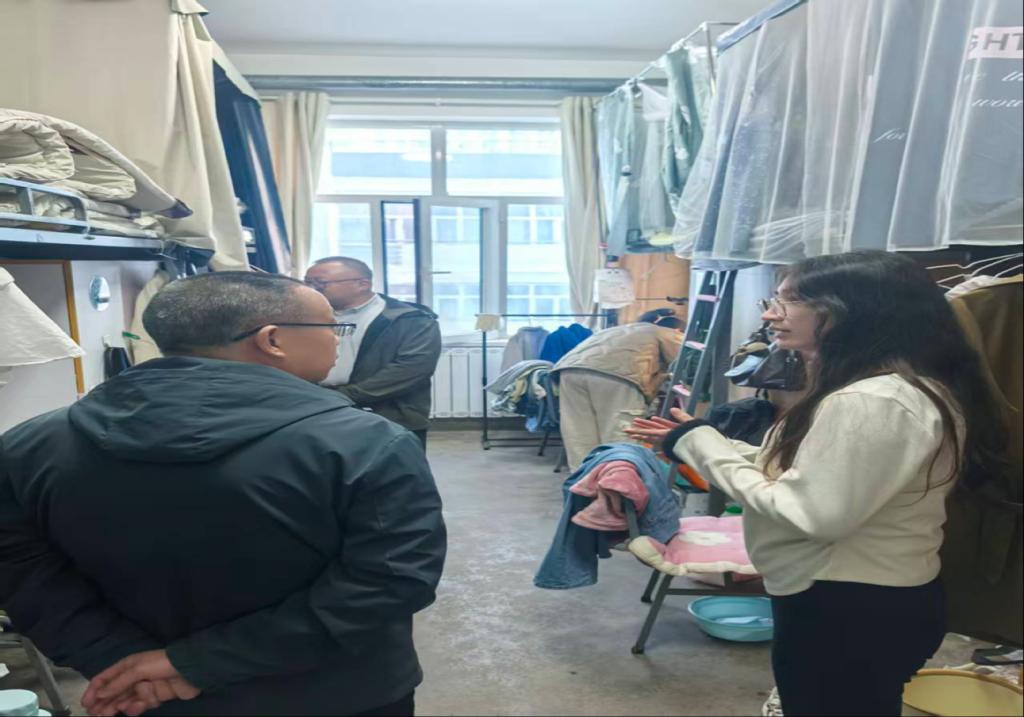在查寝的过程中,郭辉书记与侯广彦副书记还细致询问他们的学习进展和生活状况,深入了解他们在学习生活中遇到的问题。学院领导鼓励同学们要相互理解,互相支持,共同营造和谐的宿舍环境。此次查寝不仅检查了研究生宿舍的安全隐患,还进一步加强了学院与学生之间面对面的沟通交流。