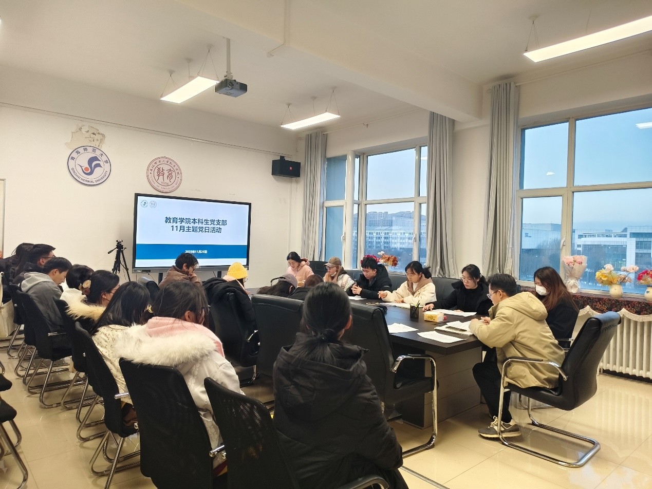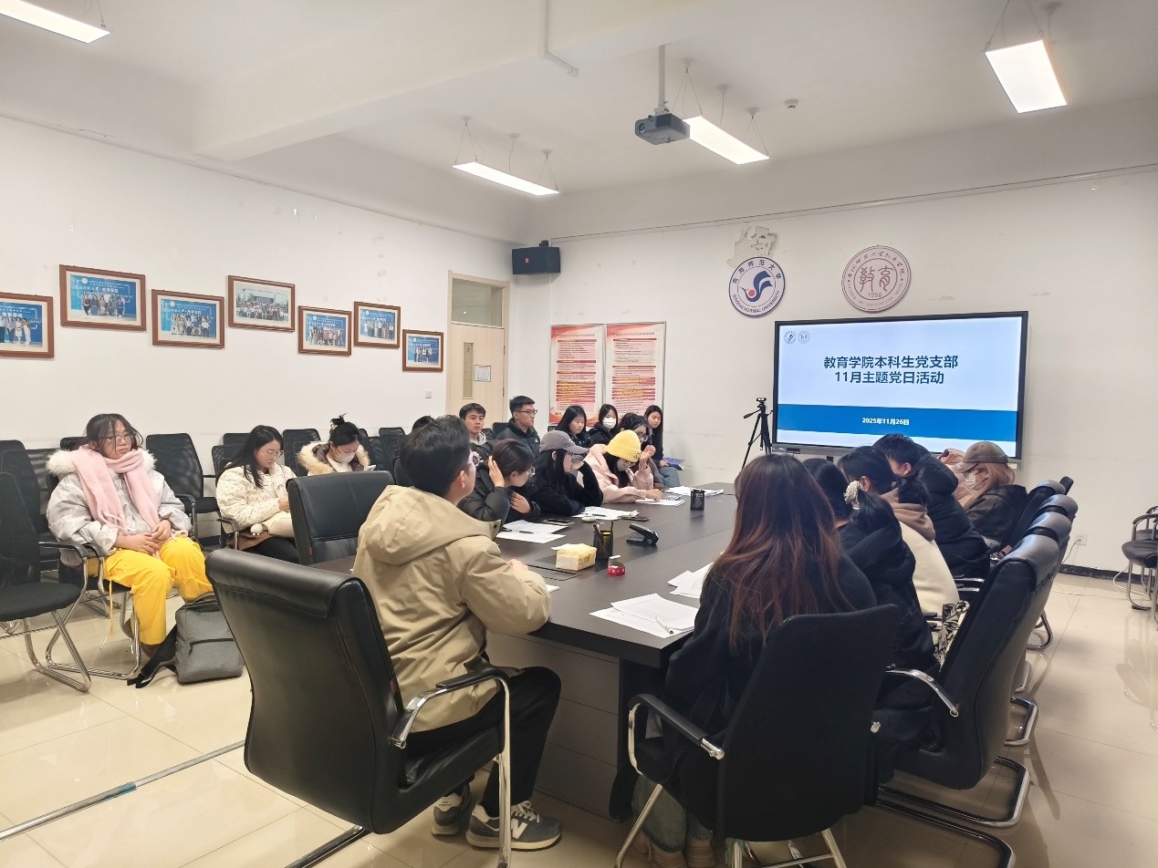 11月26日下午6时,教育学院本科生党支部在教育学院会议室组织举行11月主题党日活动。本次活动旨在通过深入学习习近平重要理论与文件精神,进一步提升支部党员的理论素养和政治站位,强化责任担当。活动由支部负责人宋泽夏主持,支部全体在校党员参加。